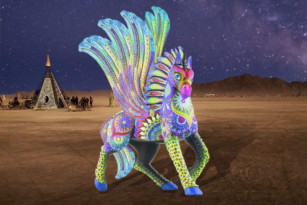 San Francisco-based artist Laura Salcido will bring three chimeric alebrijes to the Burning Man arts festival through bold sculptures: a 10-foot-tall winged horse, a six-foot-tall howling coyote, and a five-foot-diameter turtle, all painted in beautiful colors.